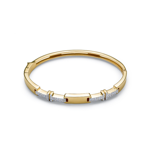 Роскошный жесткий браслет из комбинированного золота 585 пробы, украшенный сверкающей россыпью фианитов, — это воплощение элегантности и изысканности