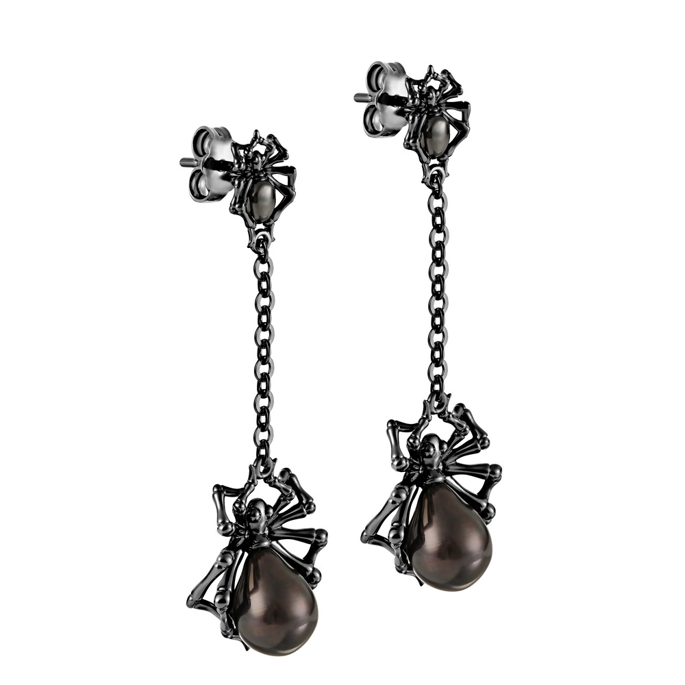 Серьги-пусеты, с подвесом в виде паучков, выполнены из серебра 925 пробы, с чернением и жемчугом коричневого цвета. Украшение представлено брендом Кабаровски из коллекции Хэллоуин.