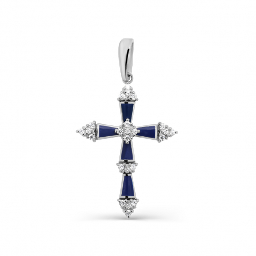 Подвеска в виде декоративного креста, украшенного синей ювелирной эмалью и фианитами, выполнена из родированного серебра 925 пробы