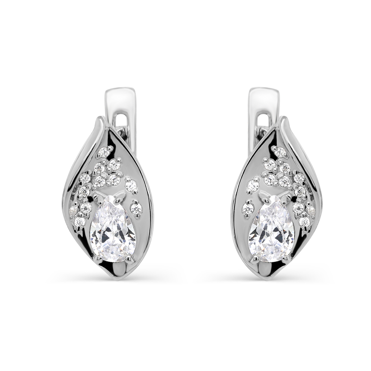 Нежные серьги, выполнены из серебра 925 пробы с родиевым покрытием, украшены искрящейся россыпью фианитов