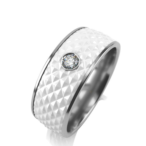 Стильное кольцо, выполнено из серебра 925 пробы, с покрытием керамики белого цвета и сияющим фианитом. Фианит не выступает относительно поверхности, за счет глухой закрепки, она надежно удерживает камень. Смотрится очень эффектно и современно.