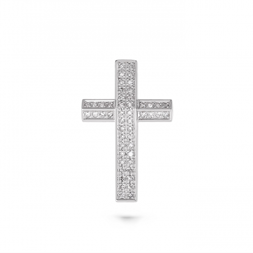 Подвеска, в виде креста, выполнена из серебра 925 пробы с родиевым покрытием, украшена россыпью искрящихся фианитов.