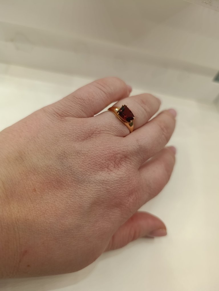 Кольцо выполнено из красного золота 585 пробы, украшено по центру гранатом оригинальной формы огранки "Трапеция"