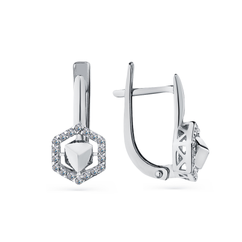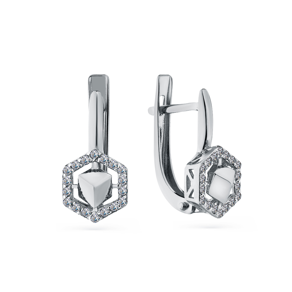 Изящные серьги из белого золота 585 пробы украшены россыпью сверкающих фианитов, блеск которых подчёркивает красоту драгоценного металла