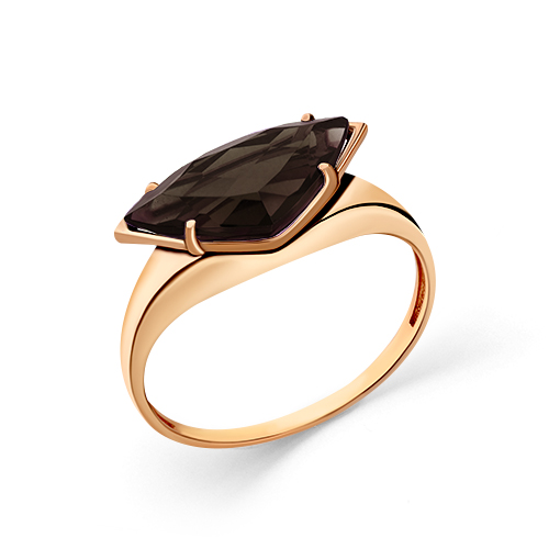 Стильное кольцо с дымчато-коричневым раух-топазом оригинальной формы огранки "Трапеция" выполнено в красном золоте 585 пробы