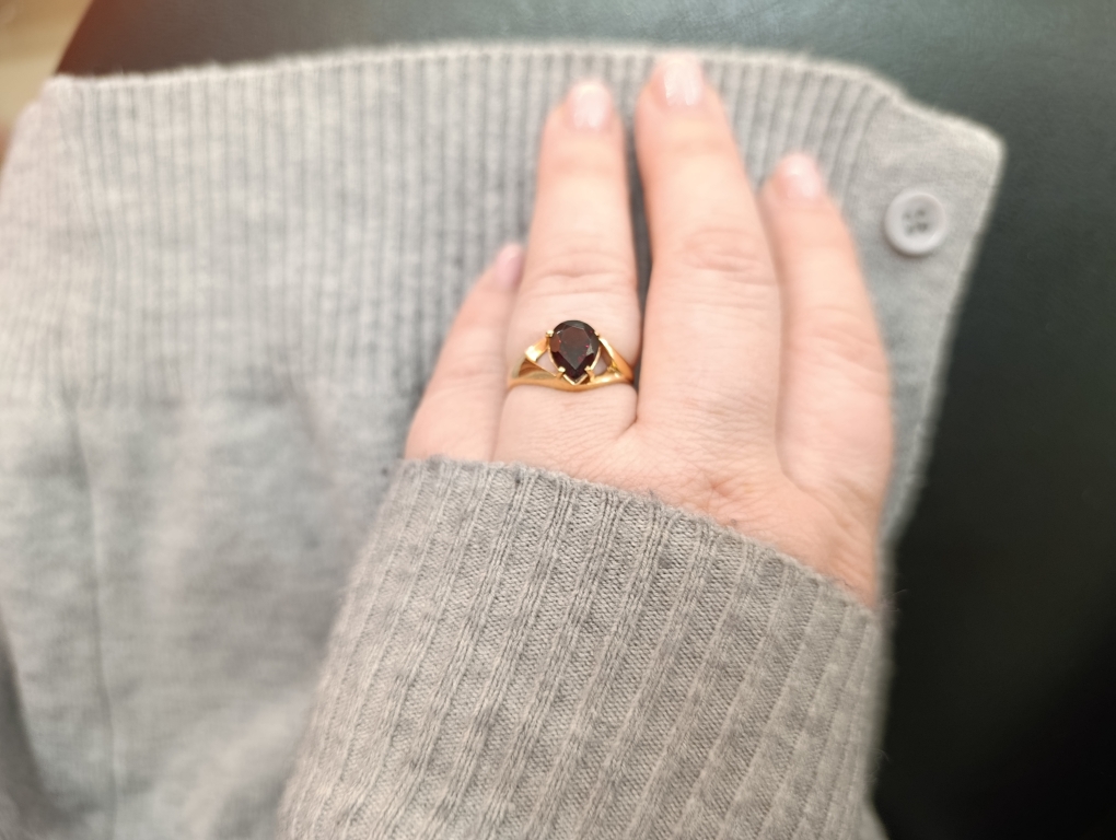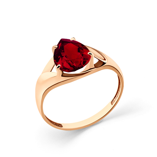 Изящное кольцо выполнено из красного золота 585 пробы, украшено гранатом формы огранки "Груша"