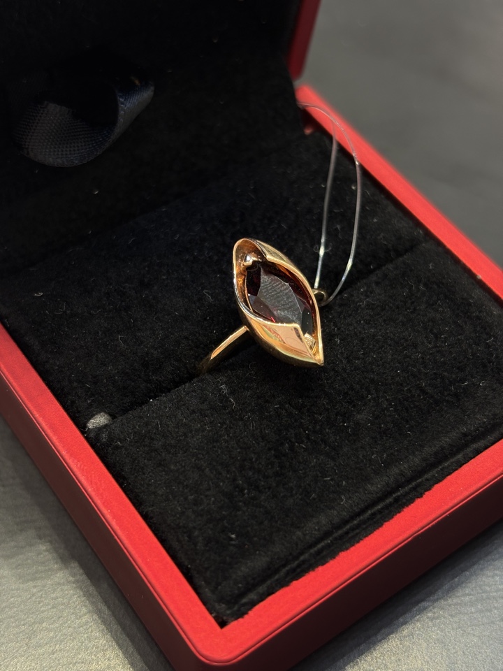 Кольцо с оригинальным дизайном - в центре внимания гранат, в окружениии красного золота 585 пробы