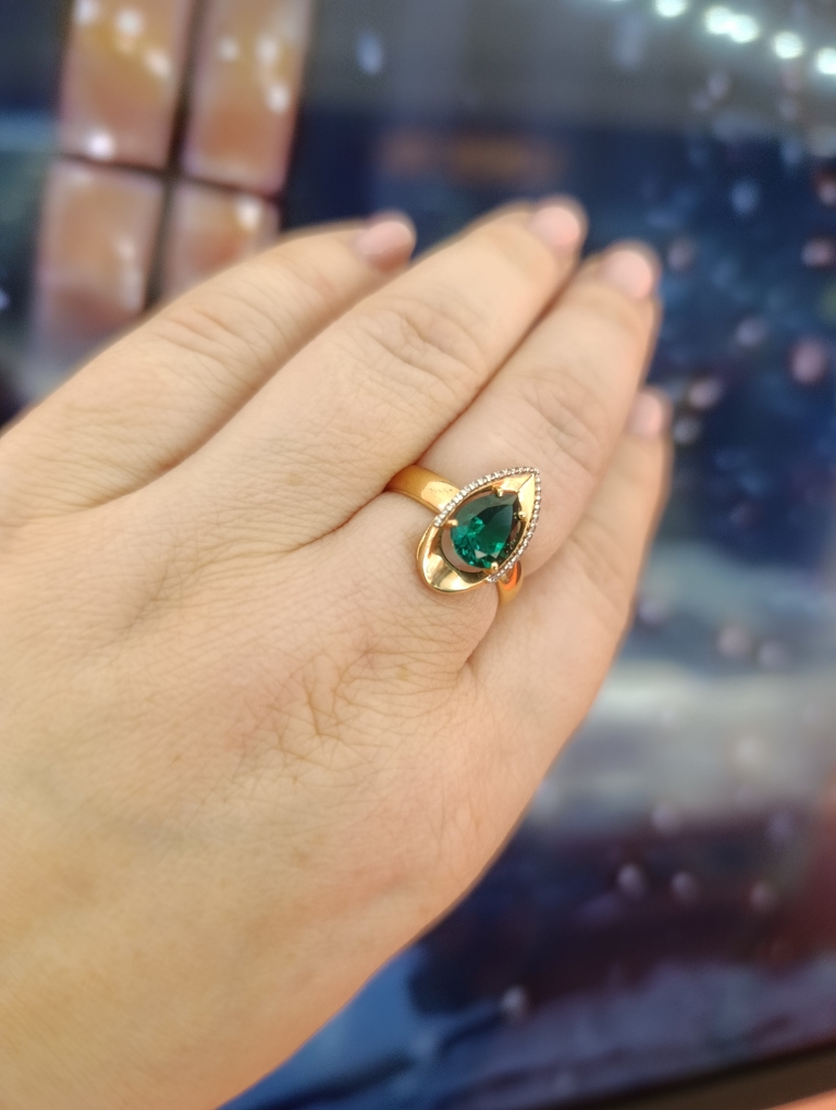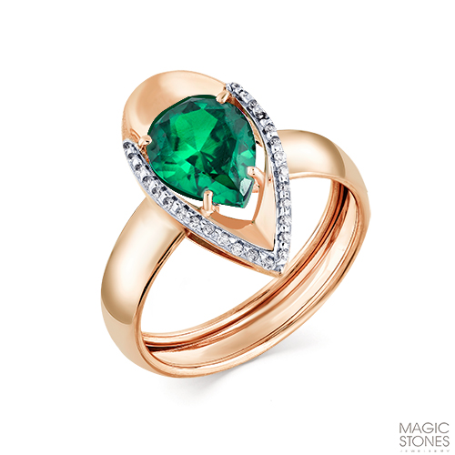 Кольцо выполнено с сочетанием красного и белого золота 585 пробы, украшено гидротермальным изумрудом в окружении сверкающих фианитов