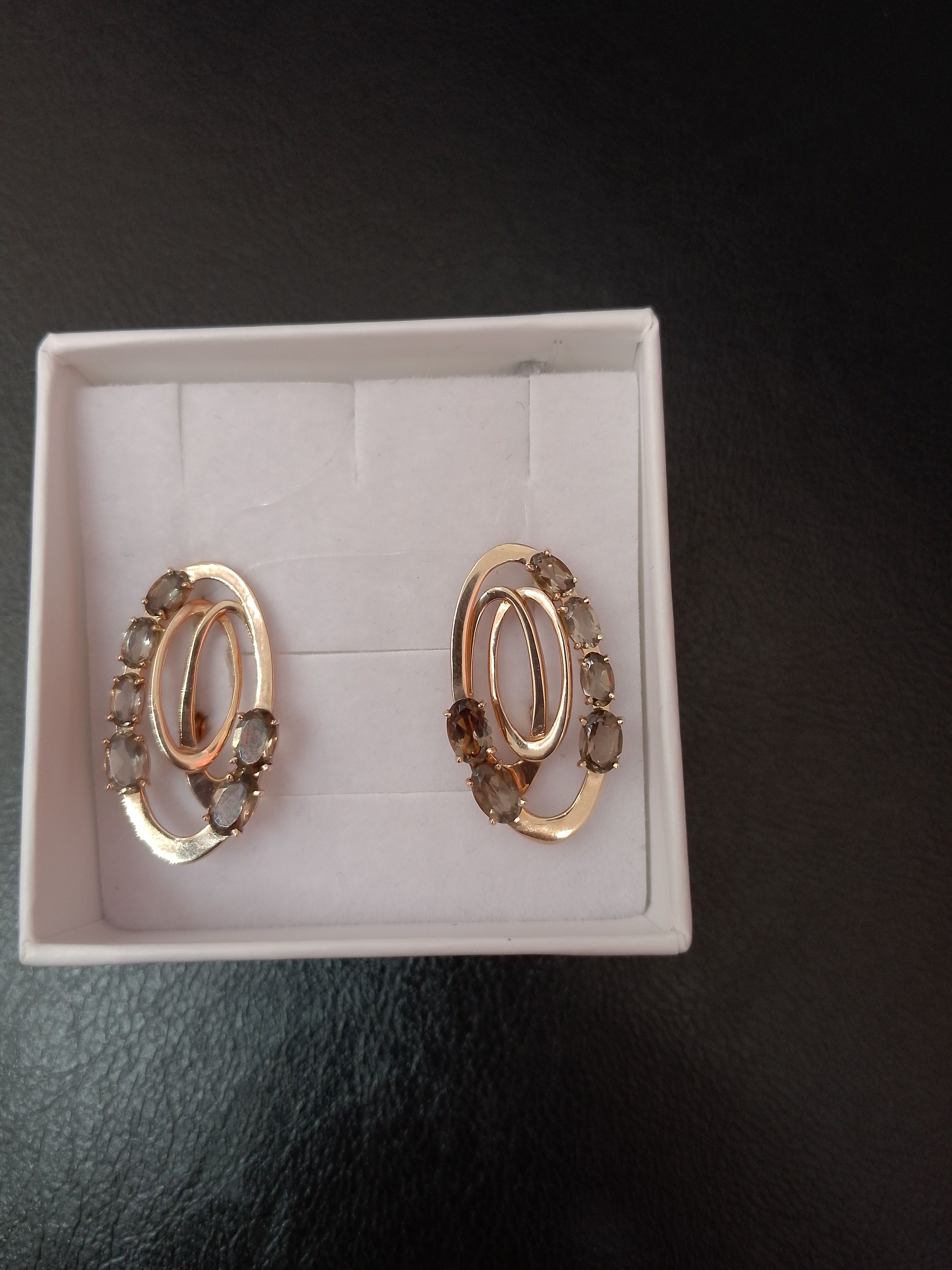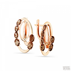 Серьги с обёмным и стильным дизайном из плавных линий красного золота 585 пробы, украшенных дымчато-коричневыми раух-топазами