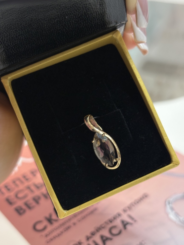 Изящная подвеска с дымчато коричневым раух-топазом, оригинальной формы огранки Маркиз, выполнена из красного золота 585 пробы