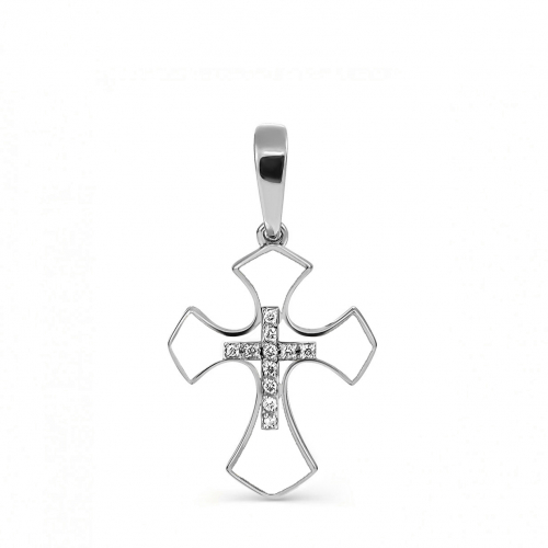 Подвеска- крест, выполнена из серебра 925 пробы с родиевым покрытием, украшена холодной малью белого цвета и сияющими фианитами