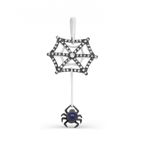 Подвеска, в виде паука с паутиной, выполнена из серебра 925 пробы с родиевым покрытием, украшена синей жемчужиной и сияющей россыпью фианитов.