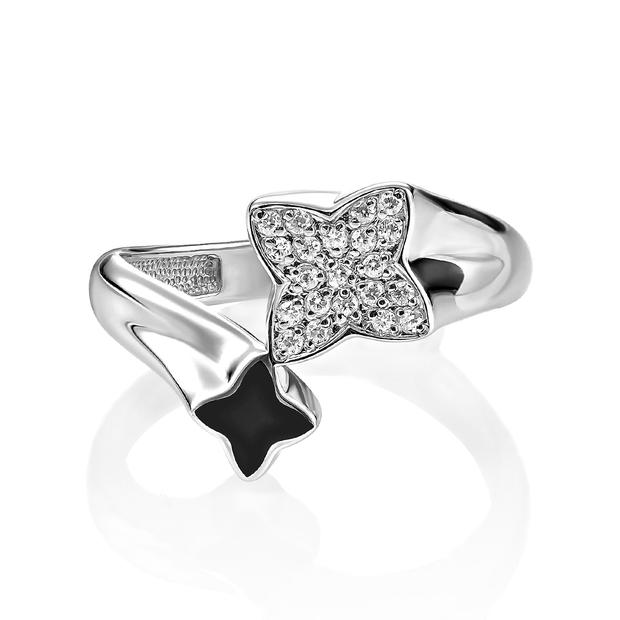 Стильное кольцо, выполнено из серебра 925 пробы с родиевым покрытием. Родий - драгоценный металл платиновой группы, который делает серебро устойчивым к повреждениям, не вызывает аллергии, не темнеет и дарит искрящийся блеск. Кольцо украшено холодной эмалью и россыпью сияющих фианитов.