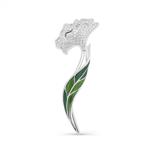 Брошь в виде изящного цветка выполнена из серебра 925 пробы, украшена россыпью фианитов и цветной холодной эмалью