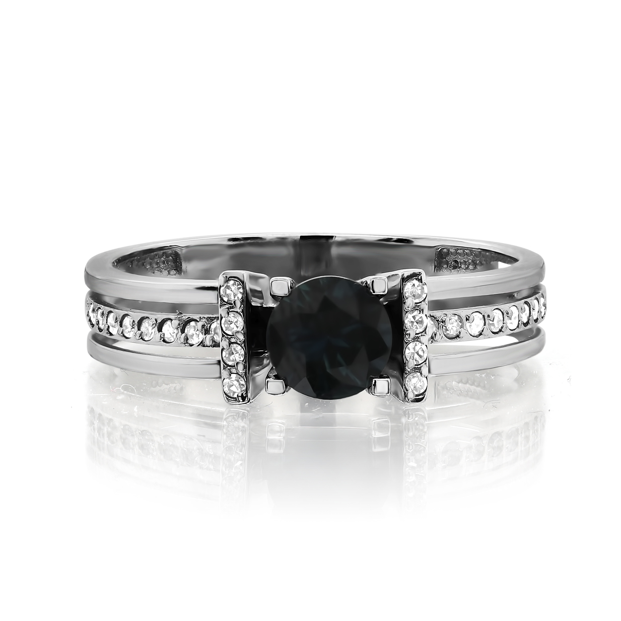 Элегантное кольцо с синим сапфиром, глубокий цвет и красоту которого подчёркивают дорожки бриллиантов, выполнено из белого золота 585 пробы