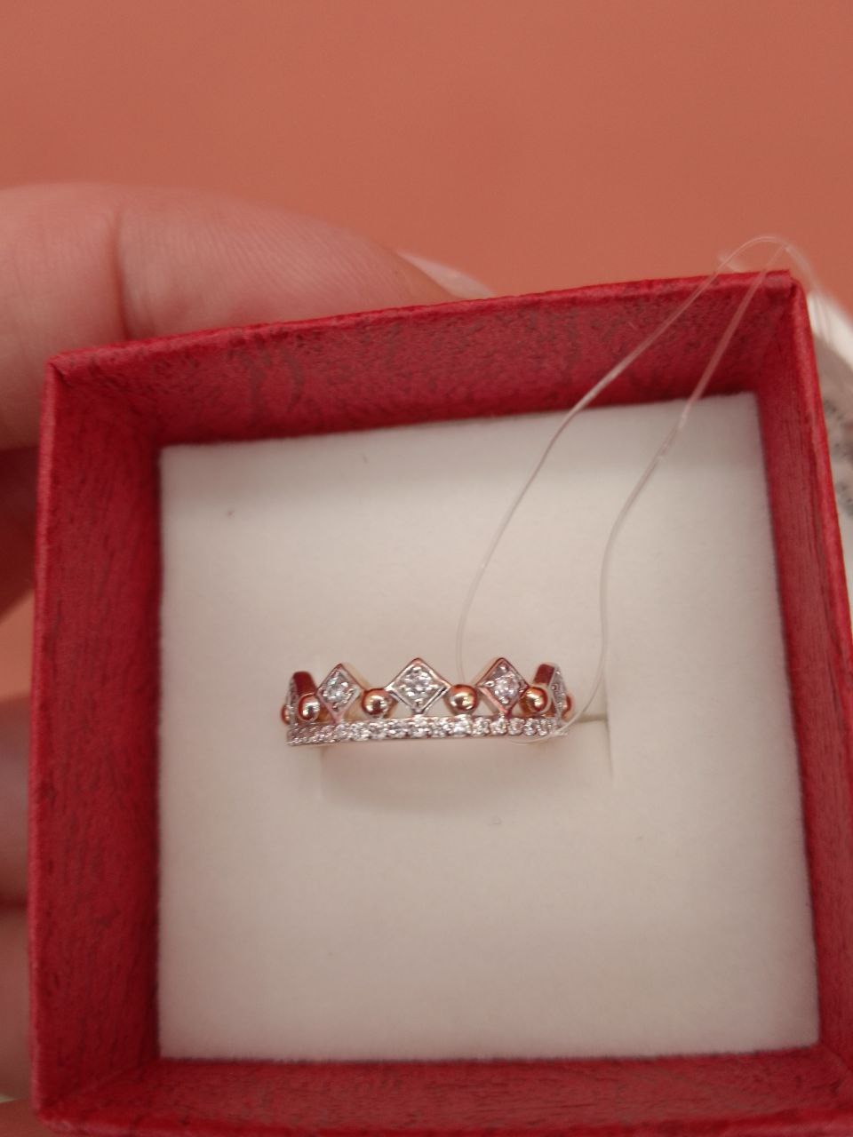 Колечко в форме короны, такое классное! Получила в подарок на свой День Рождения, очень рада)) Фиониты яркие, блестят! Самое любимое, ношу каждый день, удобное. Спасибо!