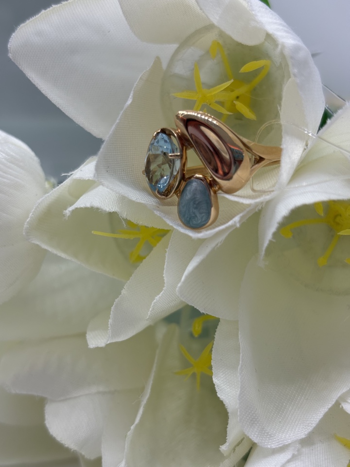 Объёмное кольцо с голубым топазом и голубой эмалью выполнено из красного золота 585 пробы