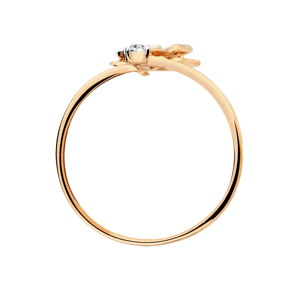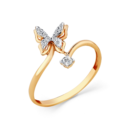 Нежное кольцо с изящным дизайном в виде бабочки, украшенной искрами фианитов, выполнено в сочетании белого и красного золота 585 пробы