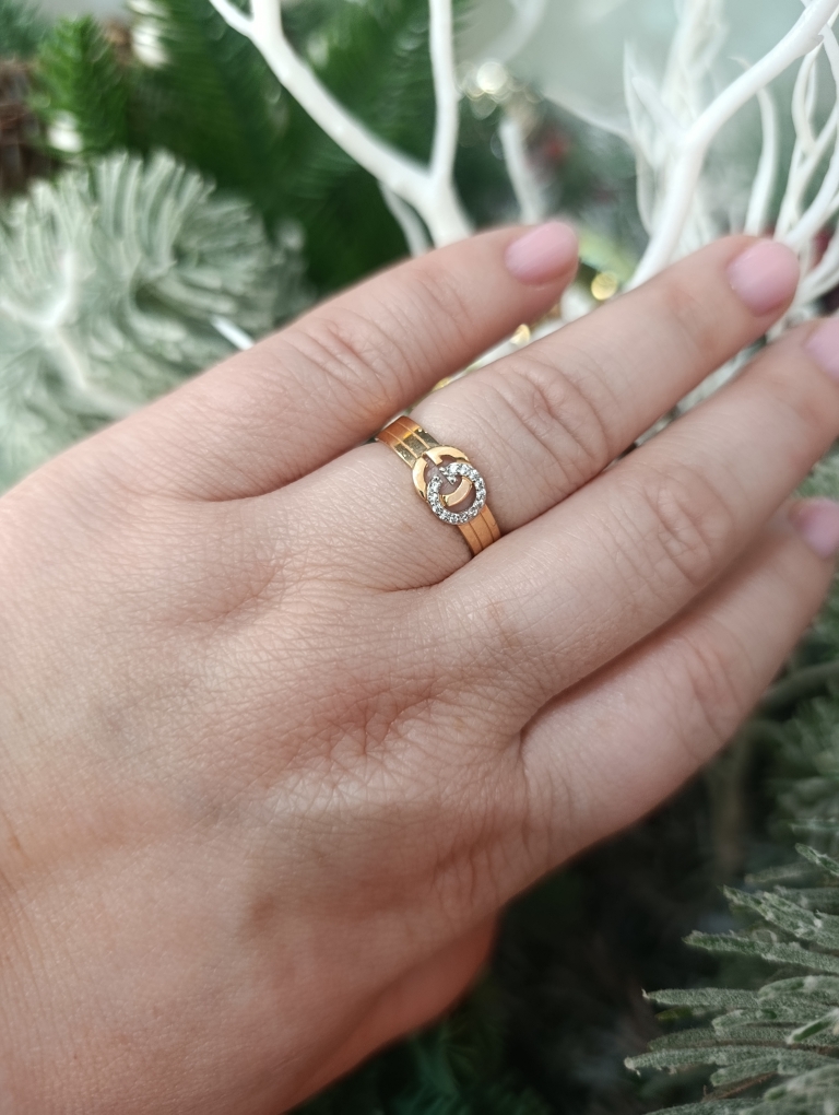 Стильное кольцо оригинального дизайна из коллекции EuroTrends, выполнено из красного и белого золота 585 пробы, украшено сияющими фианитами