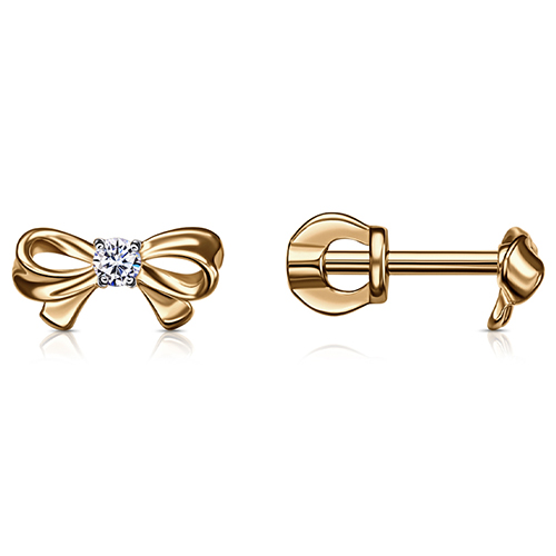 Изящные серьги - пусеты в виде бантиков, украшенных фианитами, выполнены из красного золота 585 пробы