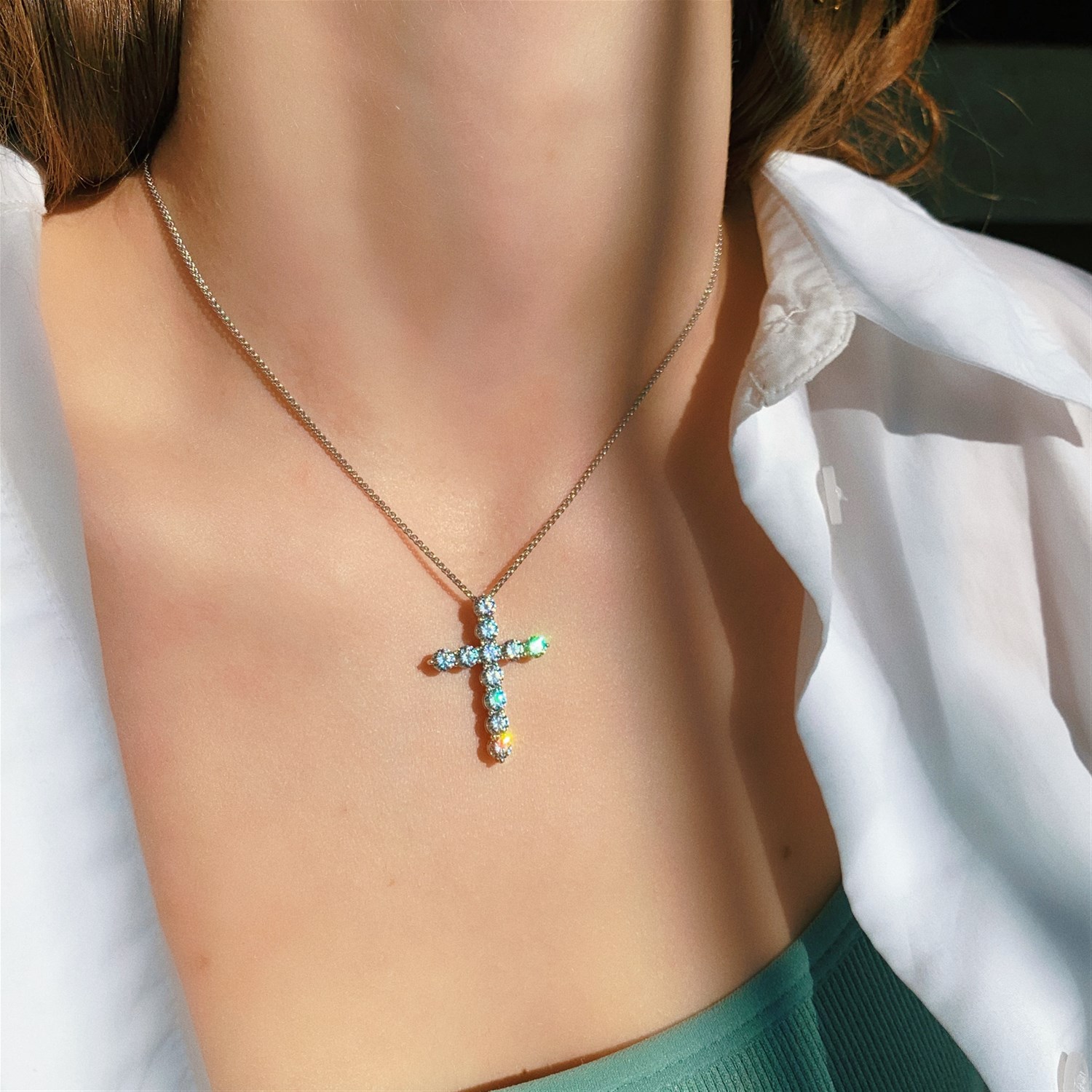 Современное колье, прочного якорного плетения, с декоративным крестом, инкрустированным яркими фианитами, выполнено из родированного серебра 925 пробы