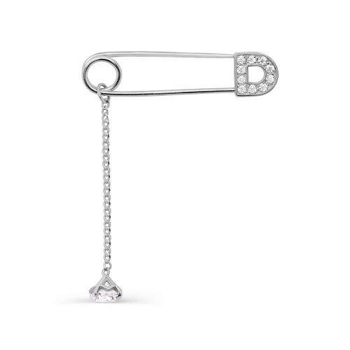Брошь в виде булавки, украшенной фианитами и изящной цепочной подвеской с фианитом, выполнена из родированного серебра 925 пробы