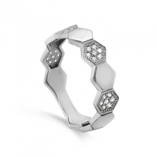 Кольцо с оригинальным дизайном, украшенным фианитами, выполнено из родированного серебра 925 пробы
