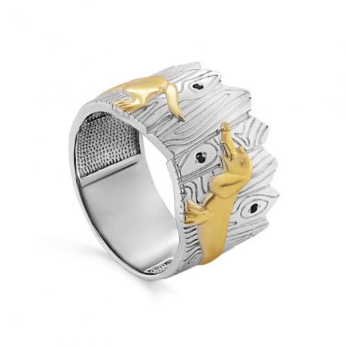 Широкое кольцо в анималистическом стиле, выполнено с сочетанием родированного и позолоченного серебра 925 пробы, украшено фианитами. Родий - это металл платиновой группы, который защищает украшение от внешних воздействий и долго сохраняет первоначальный внешний вид. Изделие представлено брендом KABAROVSKY. Средняя характеристика камней на артикул: 3 Фианит Круг 1,00. В комплект поставки входит: