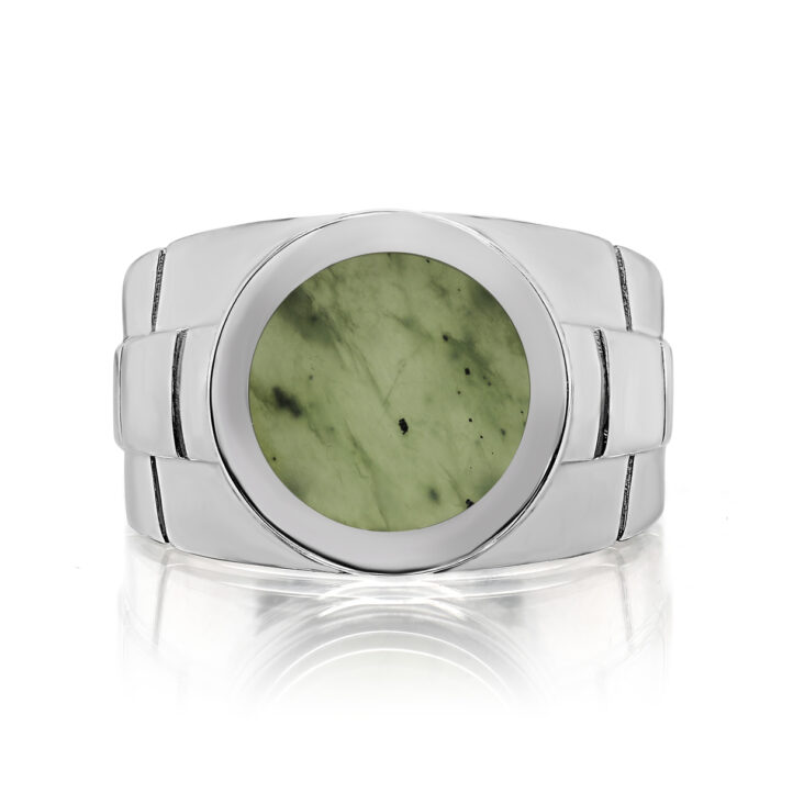 Стильное мужское кольцо с натуральным нефритом, выполнено из родированного серебра 925 пробы