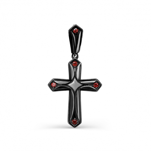 Стильная подвеска в виде креста, выполнена из серебра 925 пробы. Крест покрыт чёрной ювелирной эмалью, украшен фианитами красого цвета. Изделие представлено брендом KABAROVSKY. Вставки: 5 Фианит Кр 1,50; В комплект поставки входит: