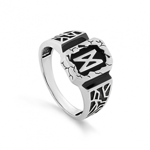 Стильное кольцо с изображением руны "ДАГАЗ", украшено чёрными керамикой и эмалью, выполнено из родированного серебра 925 пробы