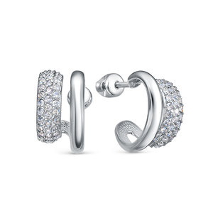 Оригинальные объемные серьги - пусеты выполнены из серебра 925 пробы и украшены россыпью сияющих фианитов. Украшение покрыто металлом платиновой группы - родием, он защищает серебро от потемнения и придает искрящийся яркий блеск. Это универсальный и стильный аксессуар, который может украсить любой образ. Тип замка - винтовой, самый надежный и комфортный. Изделие представлено брендом "DEL`TA" коллекция "Zip". Средняя характеристика камней: 78 Фианит. В комплект поставки входит: