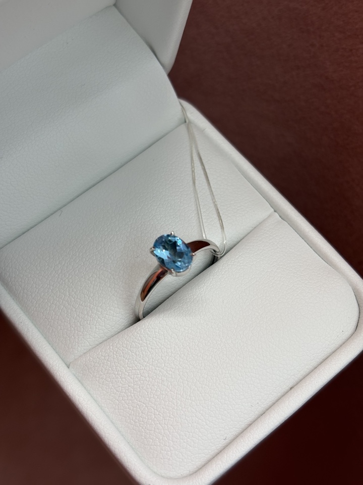 Нежное кольцо с голубым топазом выполнено из белого золота 585 пробы