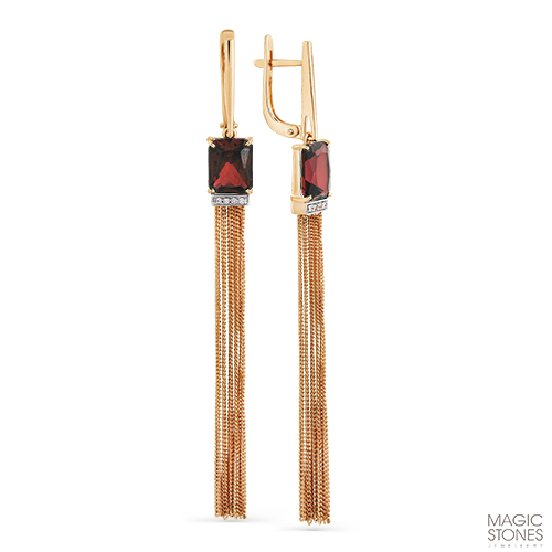 Стильные удлинённые серьги с гранатами и фианитами выполнены с сочетанием красного и белого золота 585 пробы. Подвесная часть в виде изящных цепочек подчёркивает сияние камней и приковывает внимание. Тип замка - английский, самый надежный и удобный.