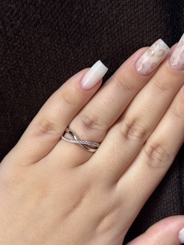 Кольцо с изящным дизайном из пересекающихся линий, одна из которых украшена дорожкой фианитов, выполнено из белого золота 585 пробы