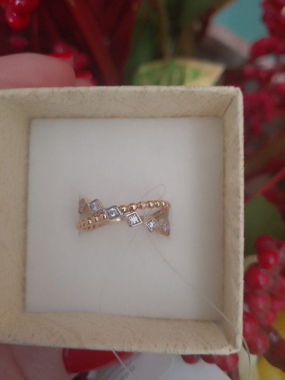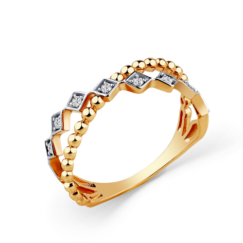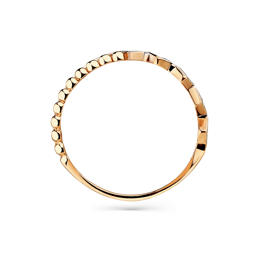 Кольцо с изящным дизайном из пересекающихся фигурных полос, одна из которых украшена фианитами, выполнено с сочетанием красного и белого золота 585 пробы