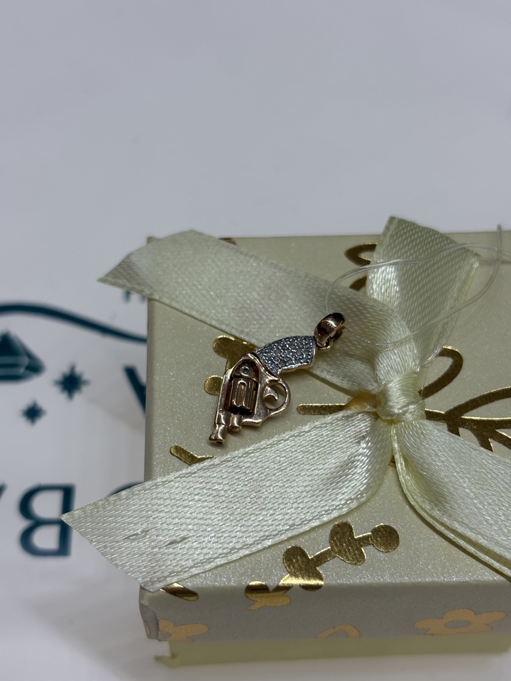 Стильная подвеска в виде изящного револьвера, украшенного сверкающими бриллиантами, выполнена из красного золота 585 пробы