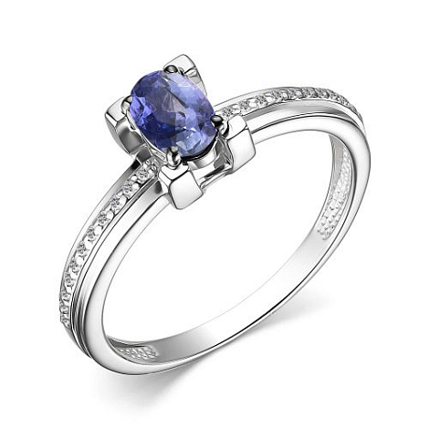 Стильное кольцо в классическом стиле выполнено из белого золота 585 пробы, украшенное природным танзанитом и сияющими бриллиантами