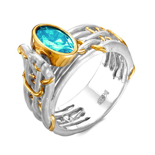 Стильное объёмное кольцо, украшенное кристаллом Swarovski мятного цвета, выполнено с сочетанием родированного и золочёного серебра 925 пробы