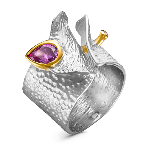 Стильное широкое кольцо с оригинально обработанной поверхностью, выполнено из родированного серебра 925 пробы. Дополнено фианитовой вставкой пурпурного цвета. Родий - это металл платиновой группы, который защищает украшение от внешних воздействий и долго сохраняет первоначальный внешний вид. Украшение представлено брендом PLATA. Вставки: 1 Фианит. В комплект поставки входит: