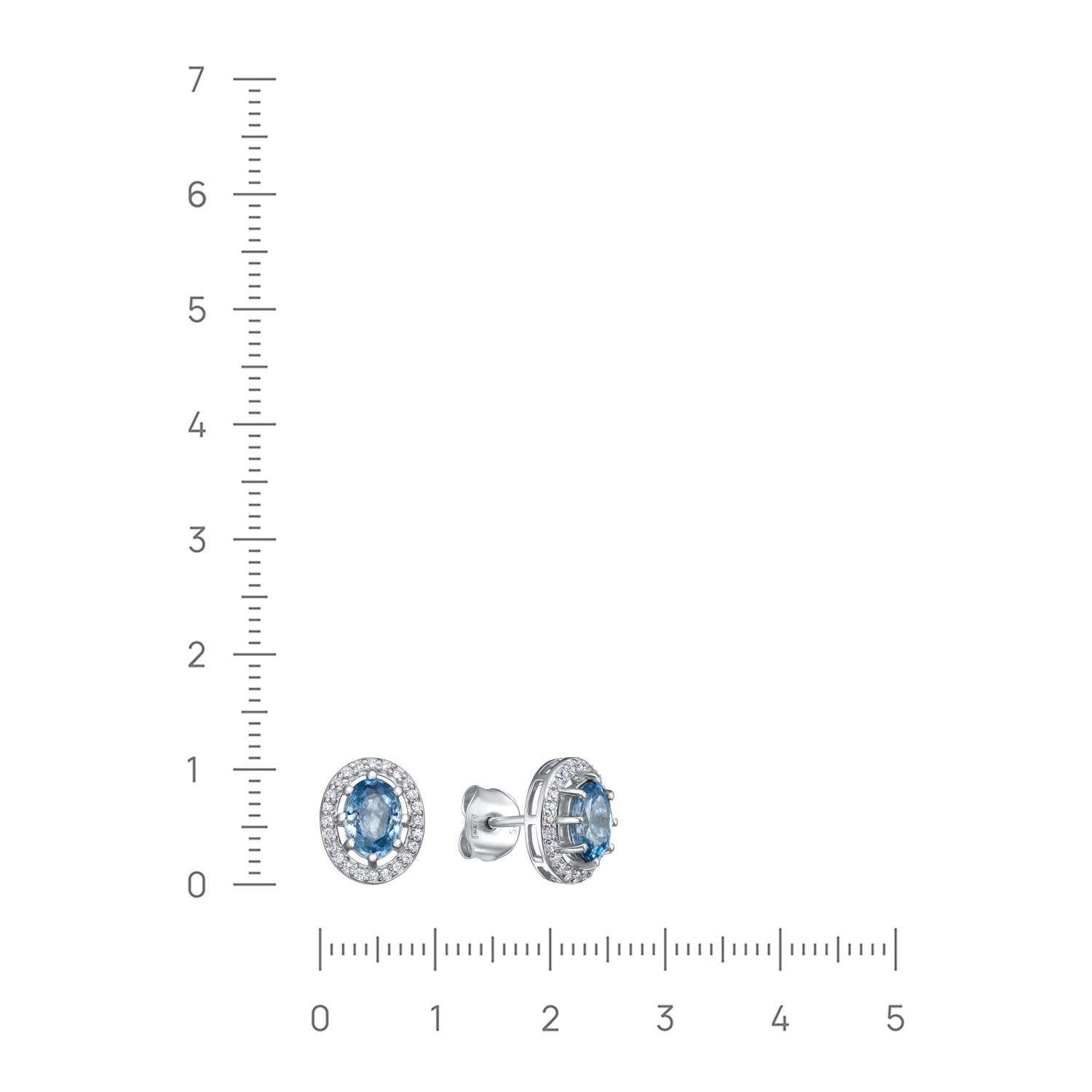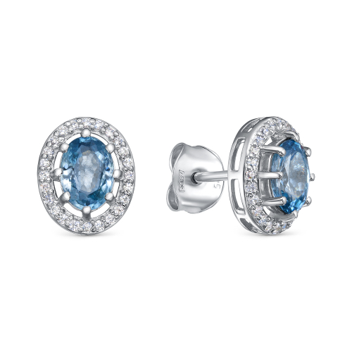 Нежные серьги - пусеты с голубыми цирконами, в окружении сверкающих фианитов, выполнены из серебра 925 пробы