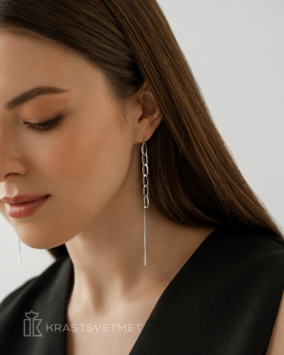 Современные серьги-протяжки с акцентом на панцирное плетения выполнены из серебра 925 пробы и покрыты родием, который защищает украшение от внешних воздействий и долго сохраняет первоначальный внешний вид