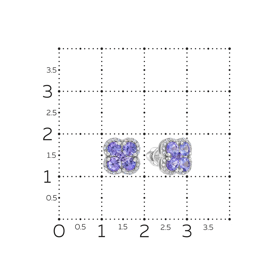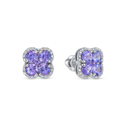 Нежные серьги - пусеты выполнены из белого золота 585 пробы, украшены великолепными танзанитами в окружении сияющих бриллиантов