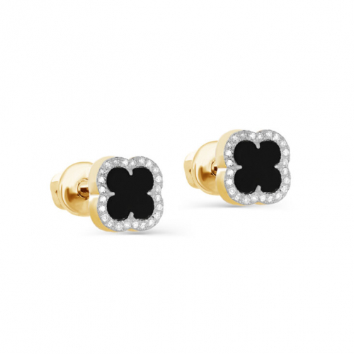 Стильные серьги - пусеты с эффектным ониксом в инкрустации сияющих бриллинатов выполнены в желтом и белом золоте 585 пробы