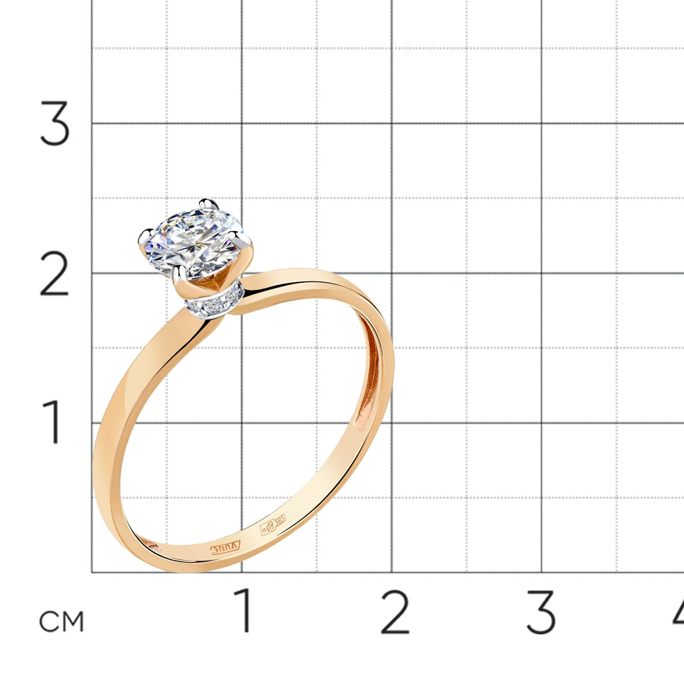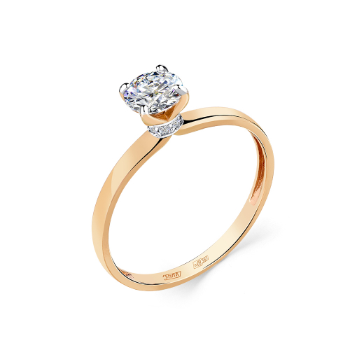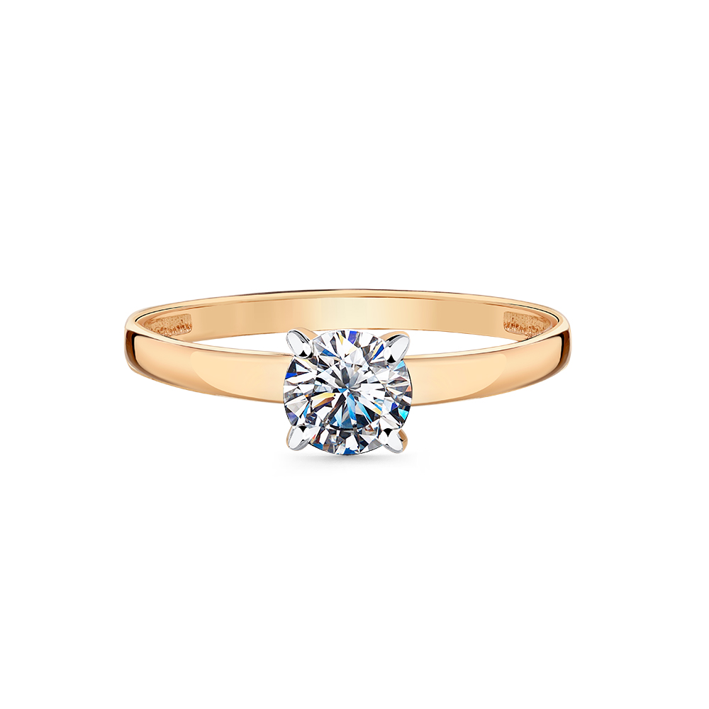 Кольцо с сверкающим фианитом в касте, подчёркнутым дорожкой фианитов, выполнено из красного и белого золота 585 пробы