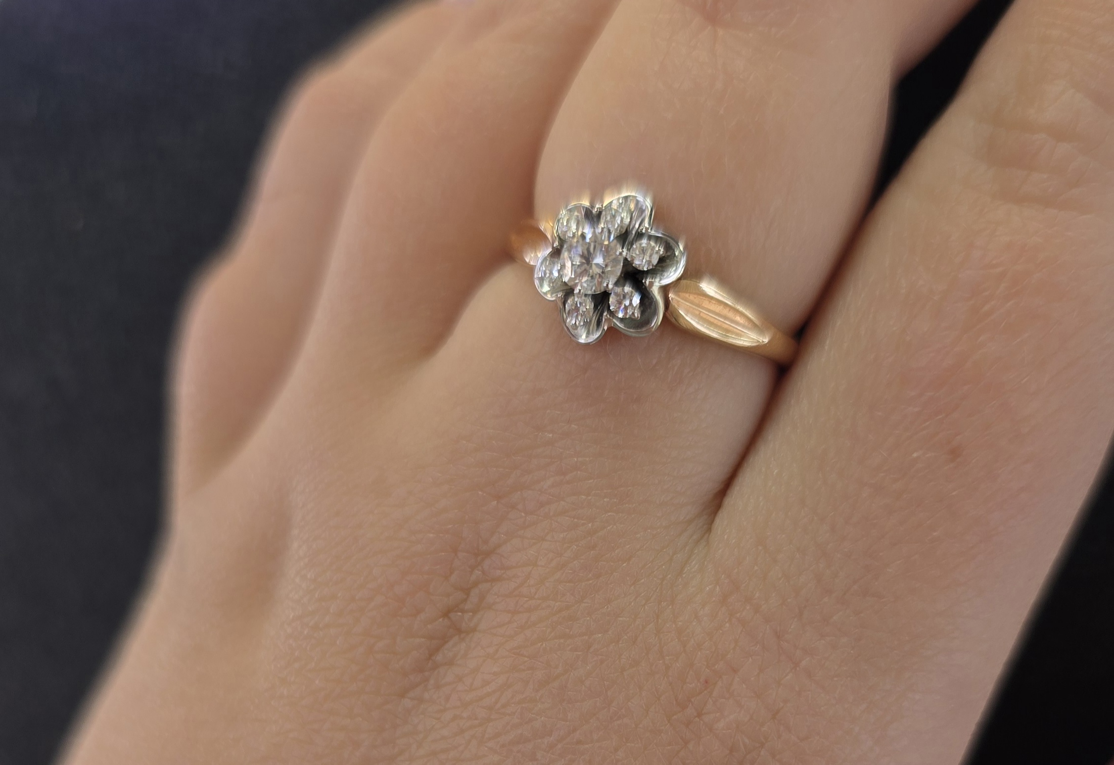 Элегантное кольцо с бриллиантами в фантазийном касте в виде цветка, выполнено с сочетанием красного и белого золота 585 пробы