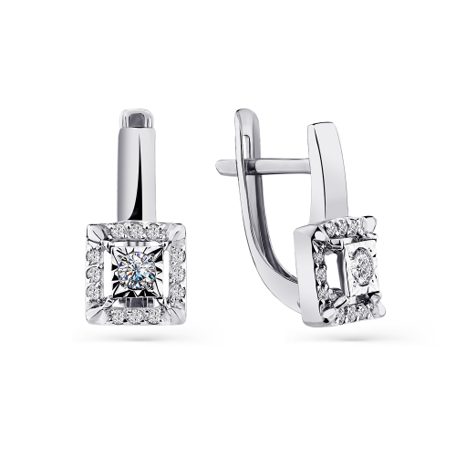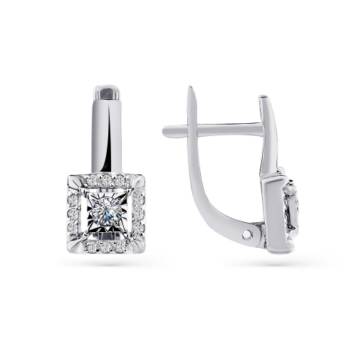 Изящные серьги с сверкающими фианитами в изящном касте квадратной формы, выполнены из белого золота 585 пробы