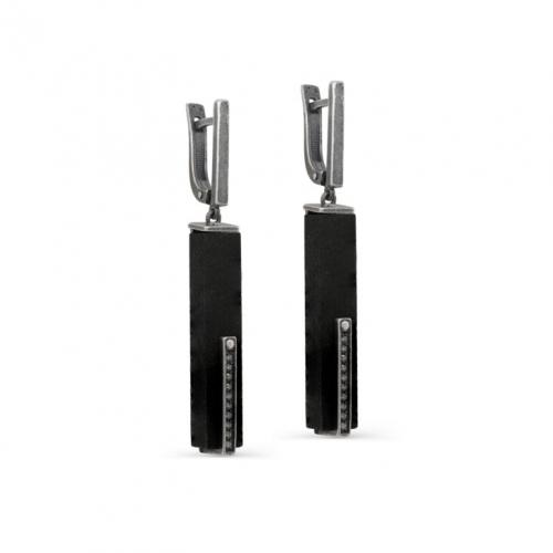 Эффектные длинные серьги из серебра 925 пробы с черным деревом граб и сияющими фианитами