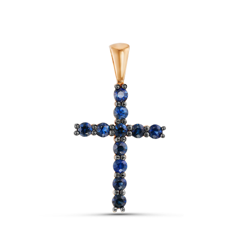 Подвеска в виде декоративного креста, украшенного сапфирами, выполнена из красного золота 585 пробы
