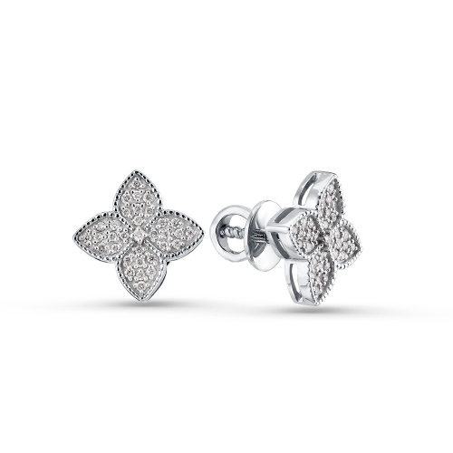 Серьги - пусеты в форме цветка, украшенные россыпью сверкающих бриллиантов, выполнены из белого золота 585 пробы